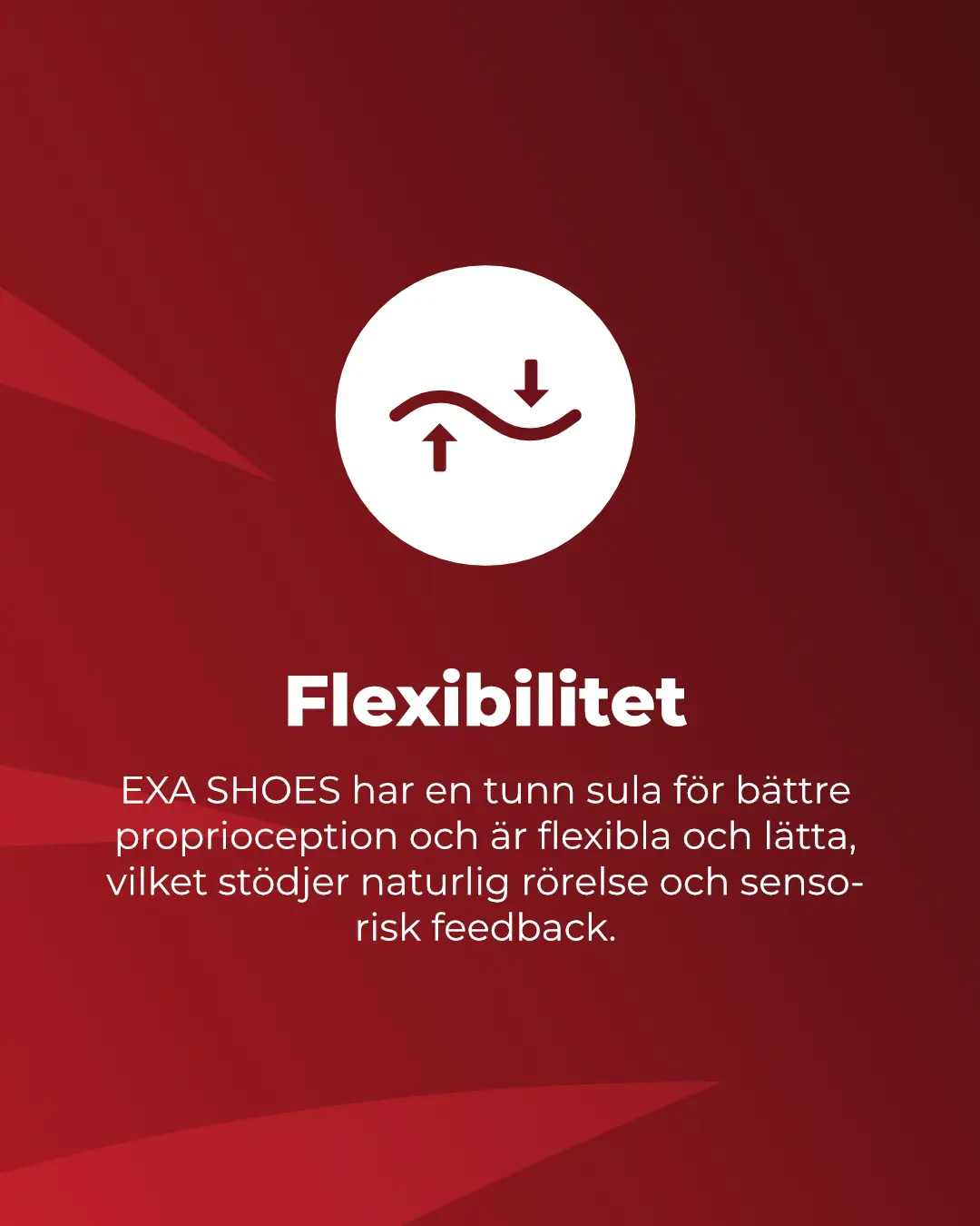 EXA SHOES är skapade för att röra sig med dig. Detta gör att sulan är tunn (stack height 7mm) för att förbättrar proprioceptionen. De är otroligt flexibla, vilket gör att din fot kan röra sig så naturligt som möjligt. Därför är våra skor otroligt lätta, vilket gör att du knappt märker att du har dem på dig. Detta kontrasterar starkt mot traditionella skor, som ofta hindrar naturlig fotrörelse och stör den sensoriska feedbacken. - Noll häl-tå dropp