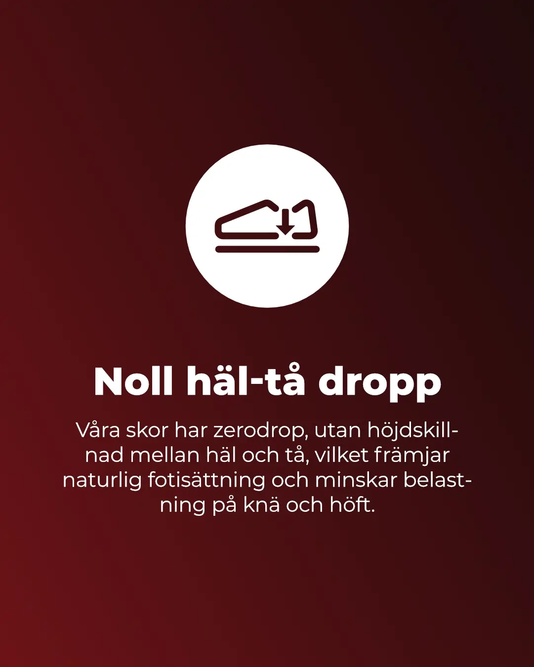 Våra skor är platta från häl till tå(även kallat zerodrop), vilket innebär att de inte har någon höjdskillnad mellan häl och framfot. Detta hjälper till att främja en naturlig fotisättning och bidrar till att förhindra skador som kan orsakas av traditionella, höga hälar. Detta minskar även belastningen i knä och höft. - Ingen Toespring