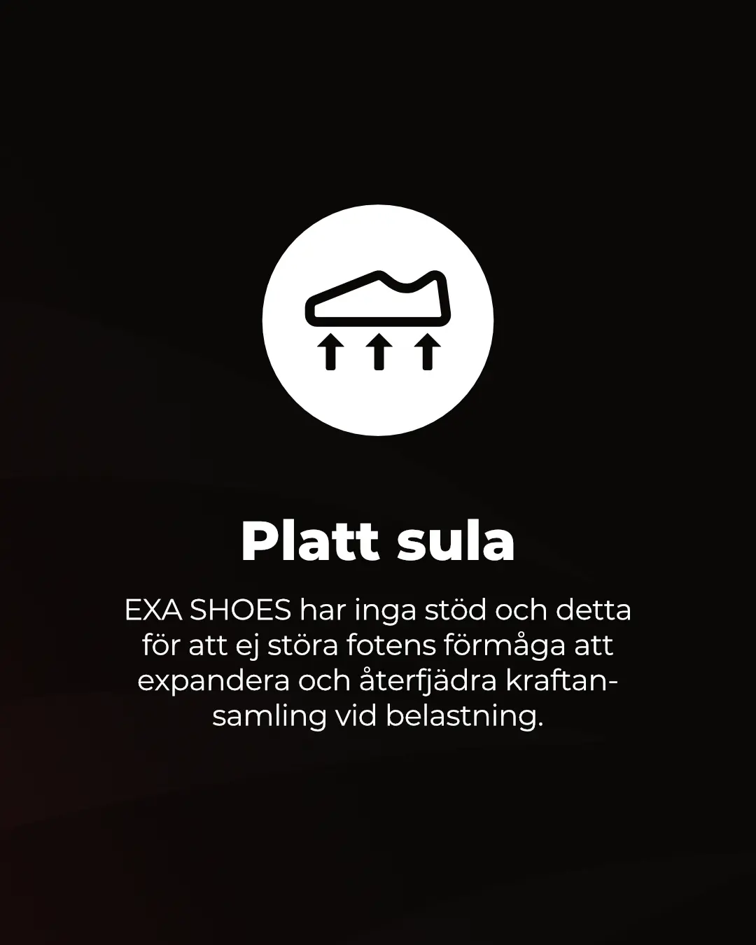 EXA SHOES har inga stöd i sulan och detta för att ej störa fotens förmåga att expandera och återfjädra kraftansamling vid belastning. Med rätt förutsättningar kan foten stabilisera sig själv.